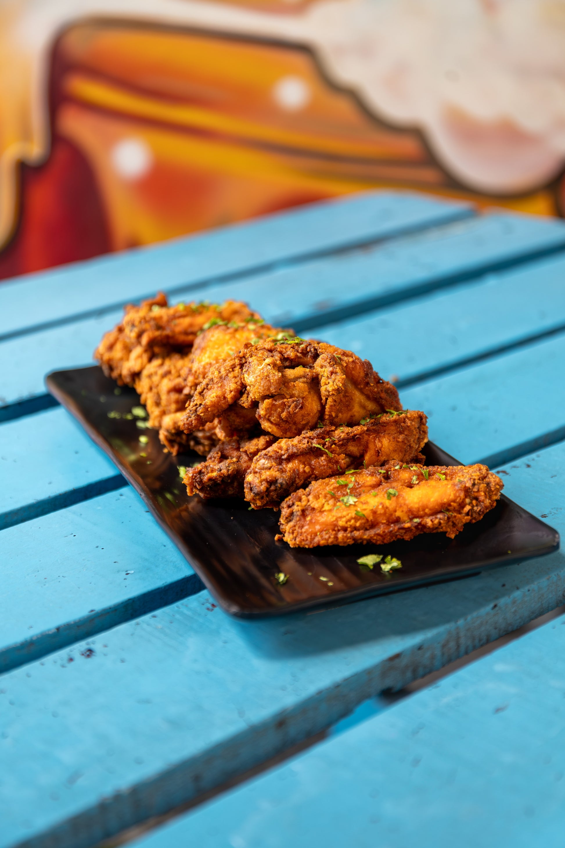 Diez (10) alitas crujientes, doradas al punto perfecto, acompañadas de papas fritas.