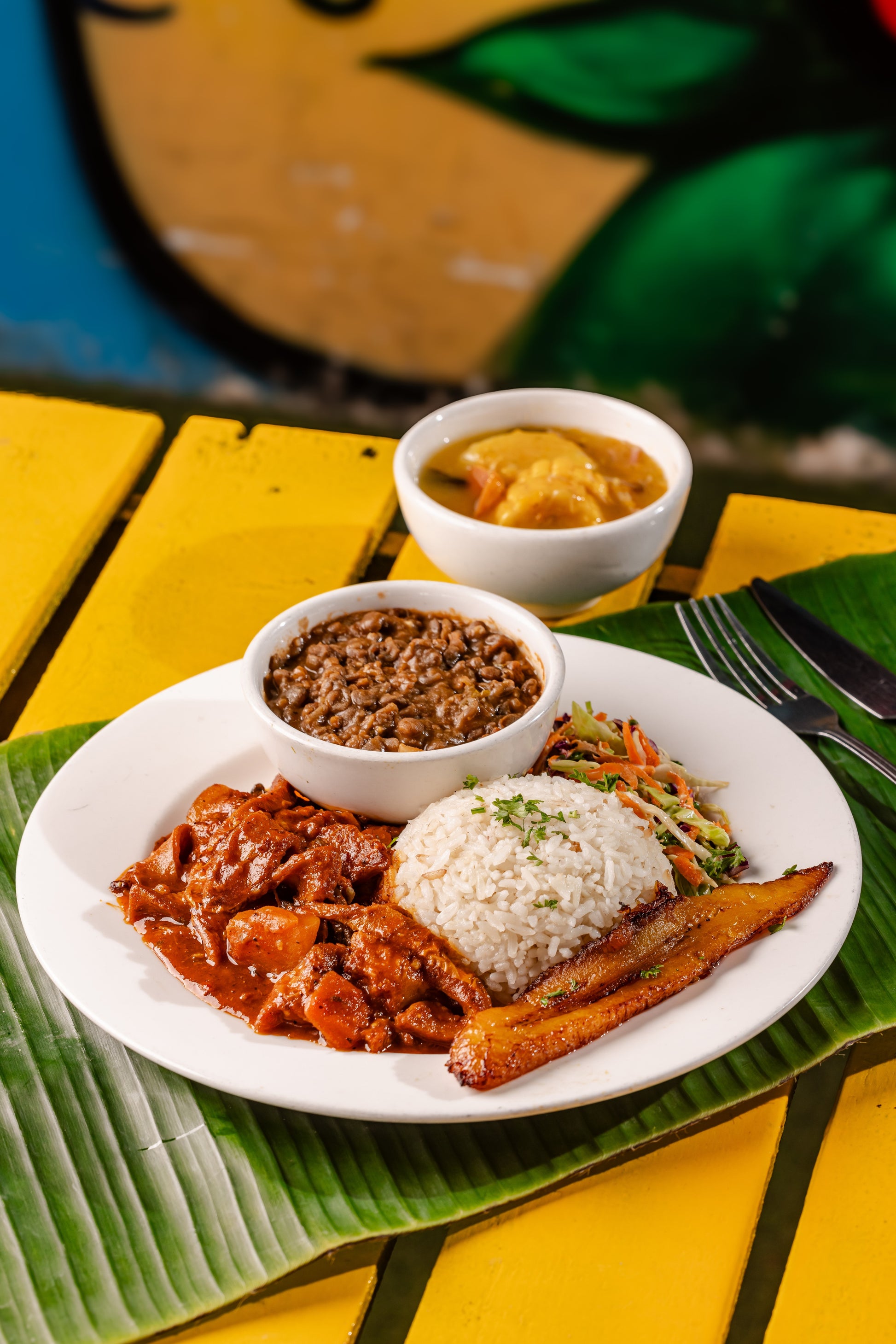 Mondongo cocido lento con rabito de puerco, chorizo, ají chombo y vegetales, servido en una crema espesa y llena de sabor, acompañado de domplin. Tradición afro en su máxima expresión.