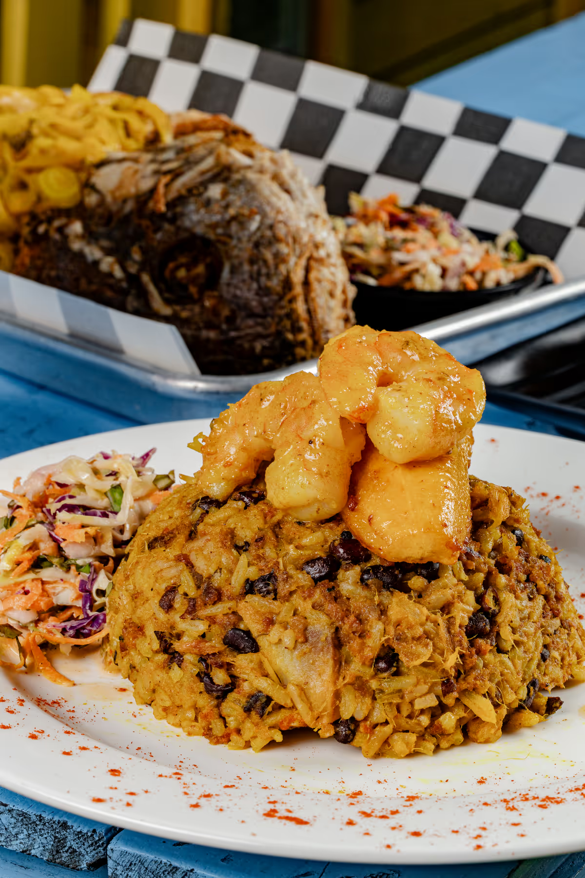 Nuestro plato insignia. Arroz con coco al puro estilo afro-caribeño, mezclado con bacalao, camaroncitos secos, rabitos de puerco, camarones frescos, vegetales, ají y un toque de curry que amarra todos los sabores en una sola olla.