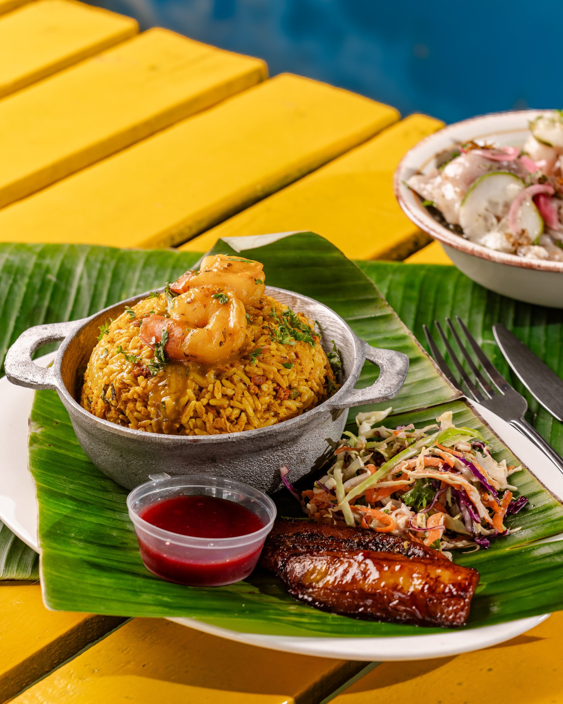 Nuestro plato insignia. Arroz con coco al puro estilo afro-caribeño, mezclado con bacalao, camaroncitos secos, rabitos de puerco, camarones frescos, vegetales, ají y un toque de curry que amarra todos los sabores en una sola olla.